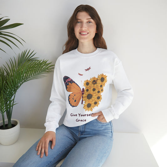 "Give Yourself Grace" Heavy Blend Crew Neck Sweater with Floral Butterfly